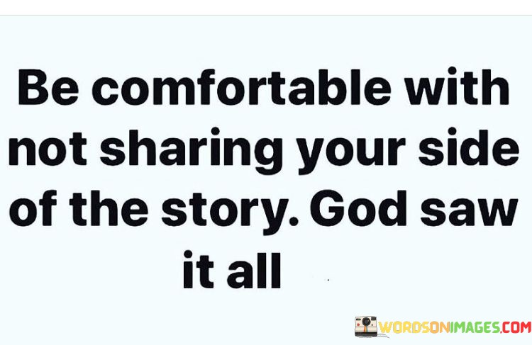 This quote encourages individuals to find comfort in the belief that God is aware of all their experiences and actions, even if they do not share their side of the story with others. It suggests that there is no need to constantly defend or explain oneself, as God has witnessed everything.
