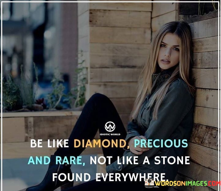 Ultimately, the quote advocates for valuing one's uniqueness. It prompts us to stand out rather than blend in. By contrasting a diamond's rarity with a common stone, the quote empowers us to embrace our special attributes and make choices that reflect our individuality.