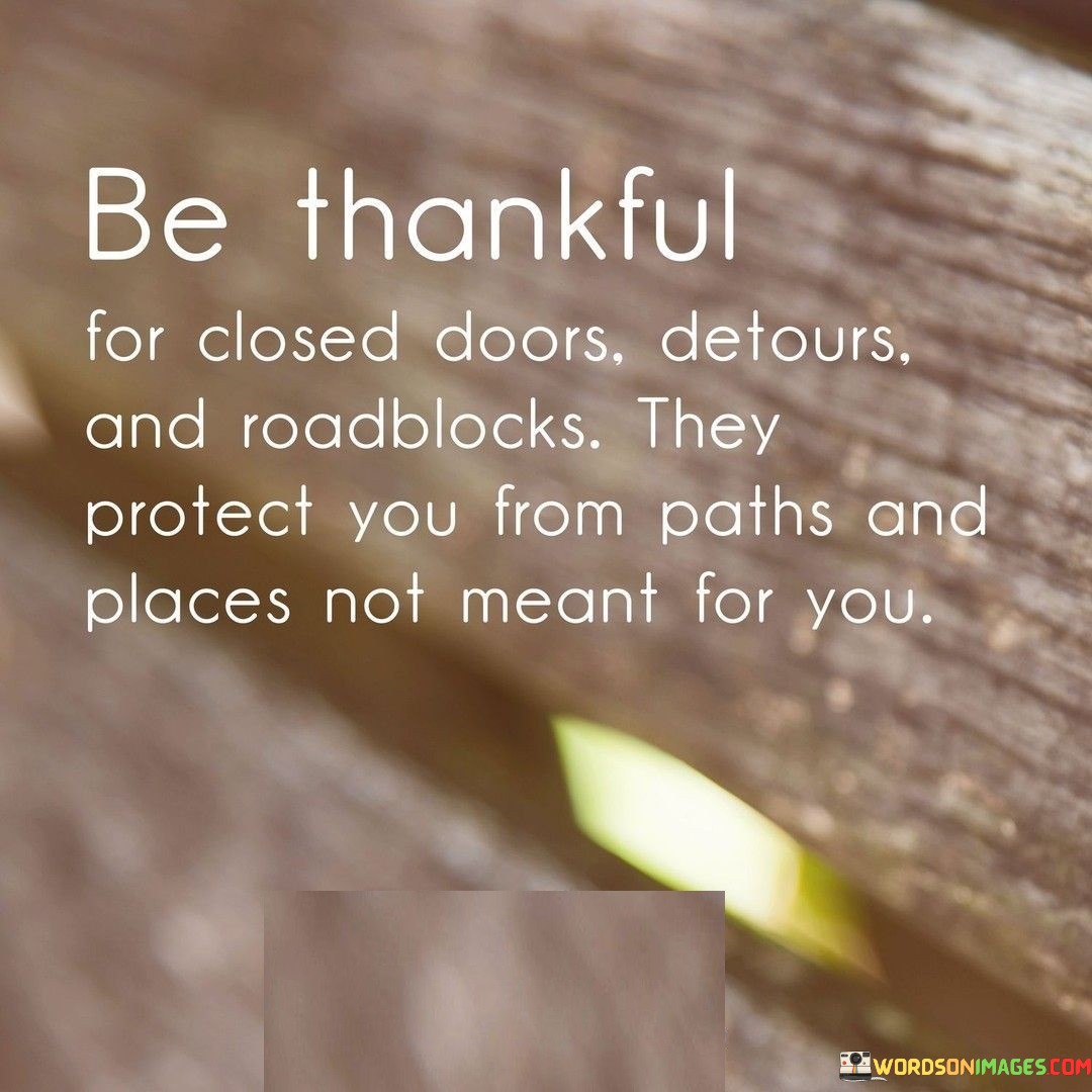 The quote advises embracing closed doors, detours, and roadblocks as protective measures. These challenges redirect individuals from paths unsuited for them. It urges gratitude for these obstacles, emphasizing their role in safeguarding against unsuitable directions. By acknowledging these hurdles as blessings, one can navigate a more authentic and fulfilling life journey.