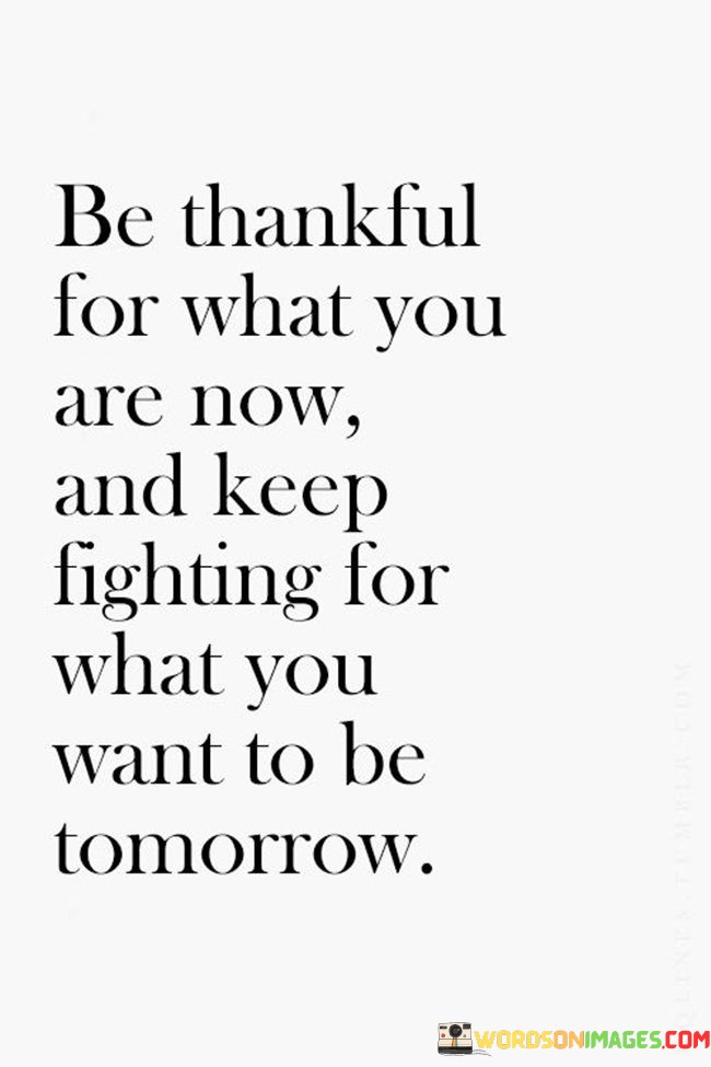 "Be Thankful For What You Are Now and Keep Fighting for What You Want to Be Tomorrow" combines gratitude with aspiration. In the first paragraph, the quote advises appreciating current circumstances. It underscores valuing the present.