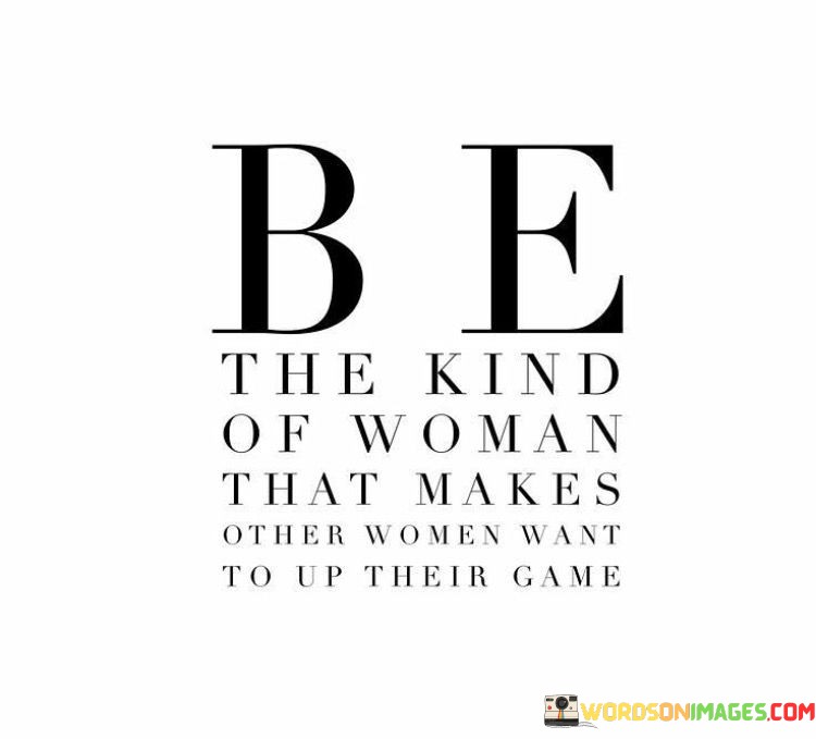 The quote "Be the kind of woman that makes other women want to up their game" is a call for women to become exemplary role models and sources of inspiration for their peers. It emphasizes the importance of personal growth, self-improvement, and empowerment as a means of uplifting and motivating other women around them. By embodying qualities such as ambition, confidence, and kindness, a woman can become a shining example of what is possible when one strives for excellence and authenticity.