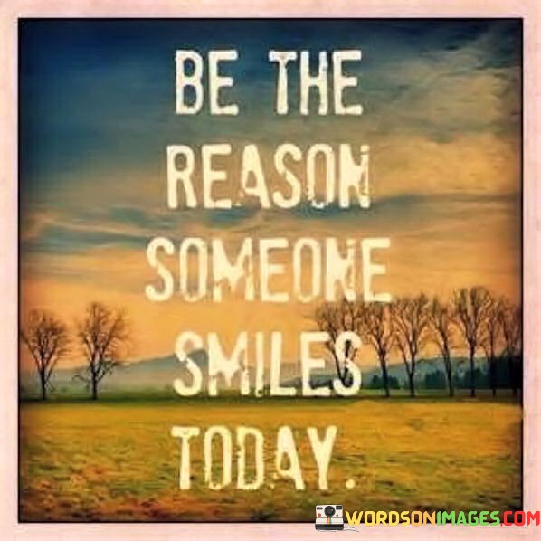 The quote encourages making a positive impact on someone's day by being the reason behind their smile. It suggests that small acts of kindness or gestures of positivity can brighten someone's mood and bring joy. The quote celebrates the power of our actions to uplift others.
