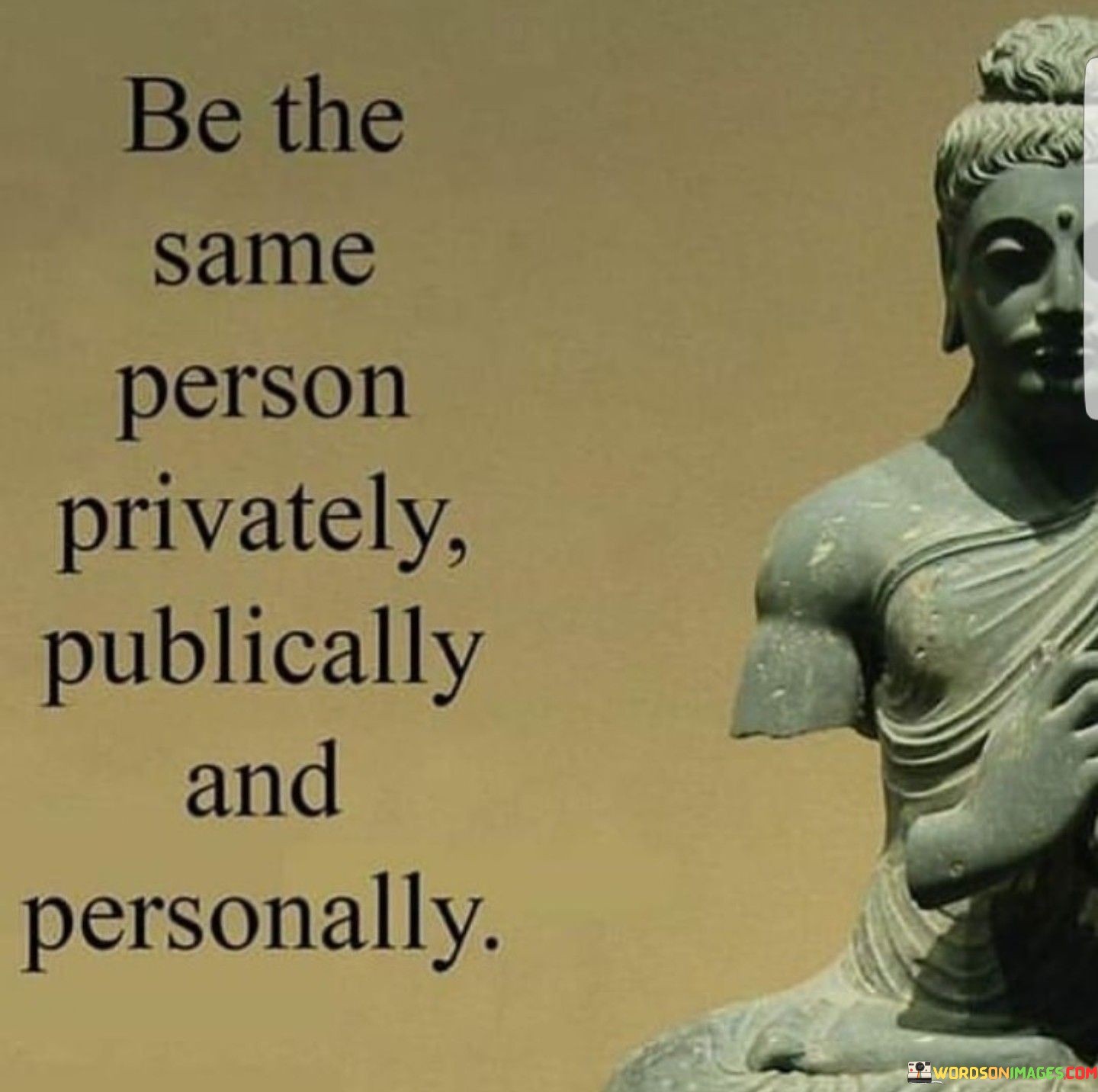 This quote encourages consistency in character across different situations. It's about being authentic and true to yourself. Whether alone, in public, or with others, staying genuine builds trust and respect. It's like having a steady foundation that people can rely on in any circumstance.
