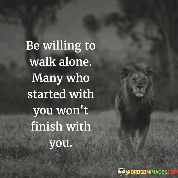 This quote underscores the reality of individual paths and changing companions. In the first part, "be willing to walk alone," it encourages self-reliance. The second part, "many who started with you won't finish with you," implies that not everyone stays in our journey.