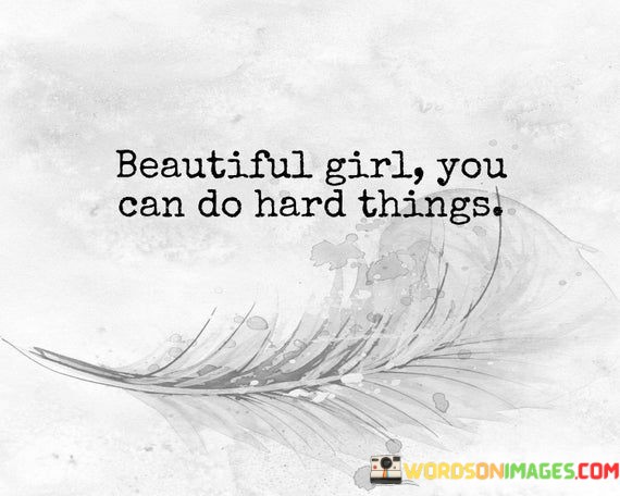 This quote is an uplifting and empowering message directed towards a "beautiful girl." It encourages her to believe in her own capabilities and reminds her that she is capable of overcoming challenges and accomplishing difficult tasks.
