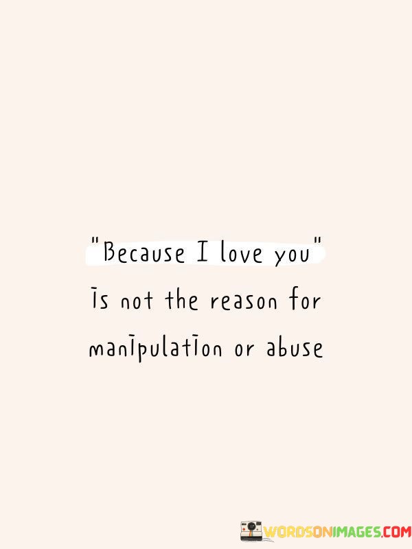 The quote underscores a crucial point about love and abuse. "Because I love you" suggests a deceptive motive. "Not the reason for manipulation or abuse" signifies the distinction between love and harmful behavior. The quote emphasizes that genuine love should never be used as a justification for mistreatment or manipulation.