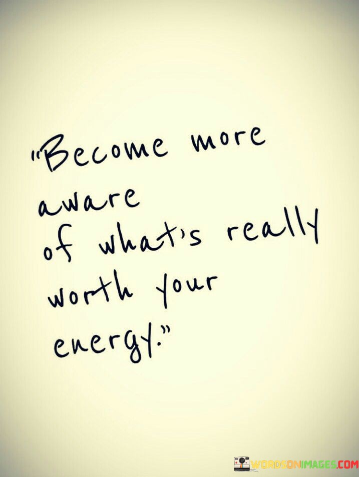 This quote encourages selective focus on meaningful pursuits. In the first part, "become more aware," it prompts heightened consciousness. The second part, "of what's really worth your energy," suggests evaluating where energy is invested.
