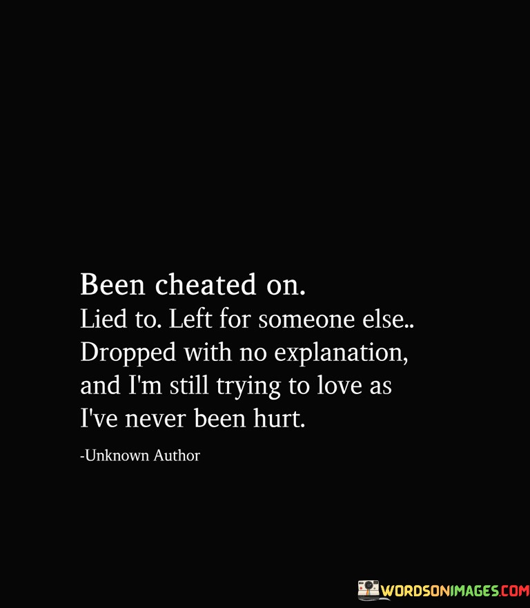 The quote, "Been Cheated On, Lied To, Left For Someone Else, Dropped With No Explanation, and I'm Still Trying to Love as I've Never Been Hurt," reflects the speaker's determination to hold onto love despite facing significant emotional challenges.