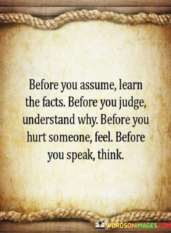 This quote advocates for thoughtful and compassionate behavior. It suggests that instead of making assumptions, individuals should seek out factual information. Before passing judgment, it encourages understanding the context. Prior to causing harm, it emphasizes empathy, and before speaking, it urges careful consideration.