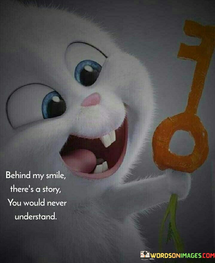 This quote conveys a sense of mystery and complexity behind a person's outward demeanor. It suggests that the smile someone presents to the world conceals a profound and personal story that others may not fully comprehend.