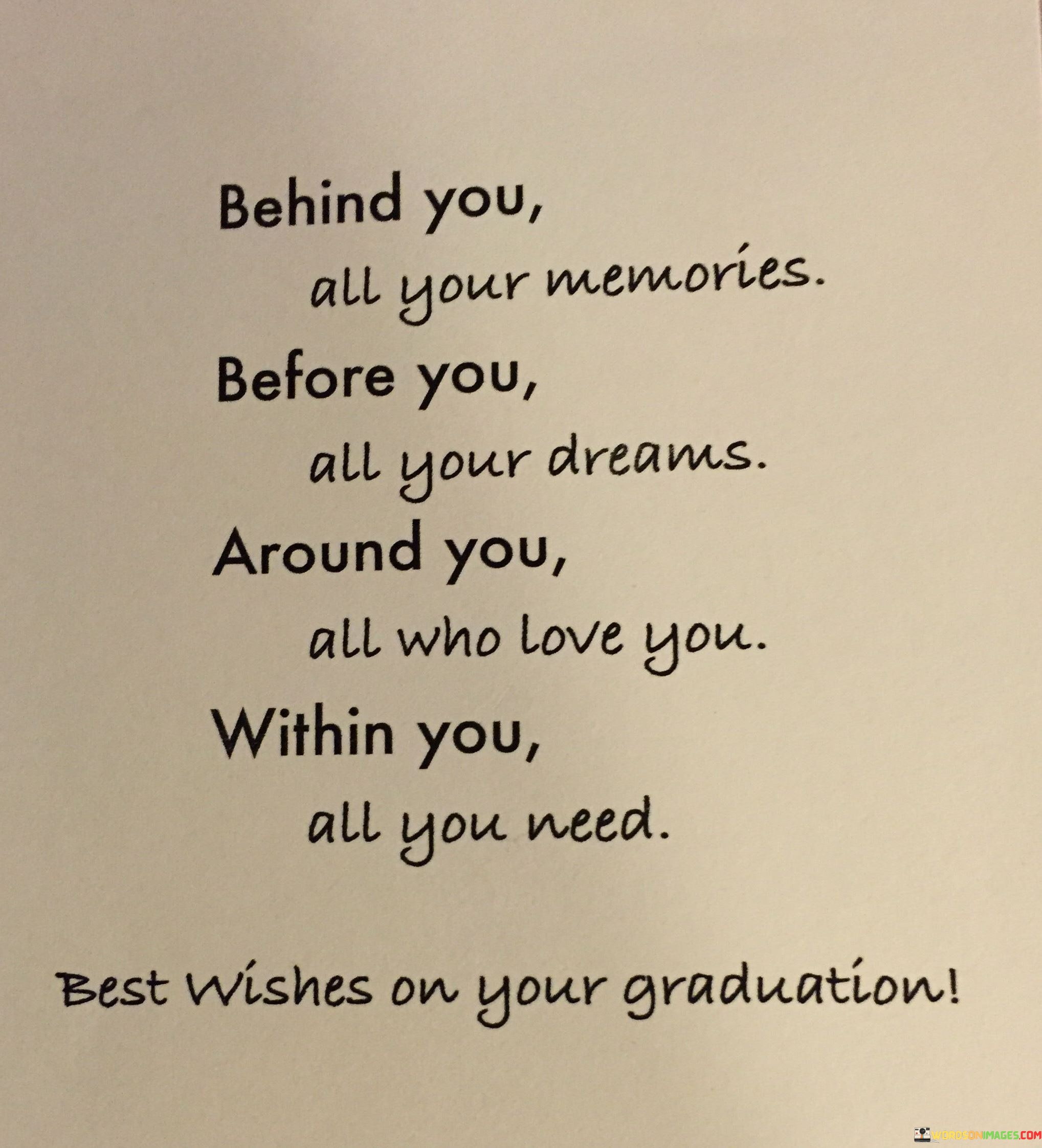The quote encapsulates a comprehensive perspective on life. The first paragraph depicts the accumulation of "memories" behind an individual, reflecting the past that has shaped their identity and experiences. It implies that one's history contributes to their present self.