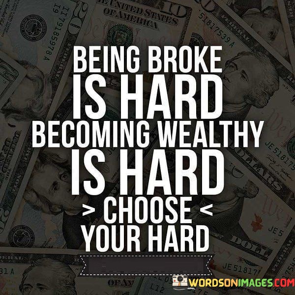 This quote highlights the notion that both being financially challenged and striving for wealth come with their own challenges. It suggests that life presents different forms of difficulty, and individuals must make a choice between the challenges they want to face. Being broke, dealing with financial struggles, and making ends meet is undeniably hard, requiring constant effort to meet basic needs.