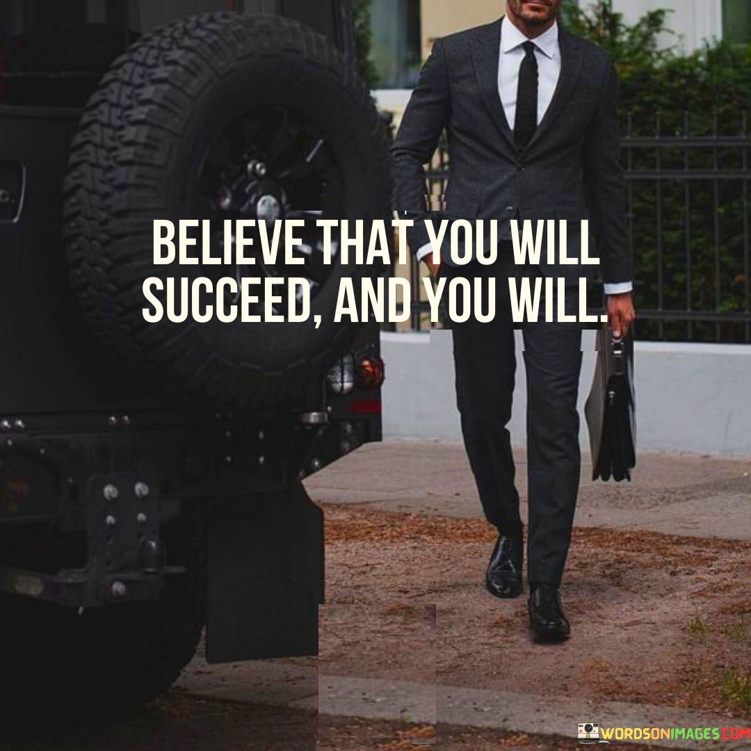 The quote "Believe That You Will Succeed And You Will" emphasizes the influence of one's beliefs on their outcomes. This phrase underscores the power of positive thinking and self-confidence in shaping one's journey towards success. By nurturing a strong belief in their abilities, individuals can enhance their motivation and take purposeful actions.