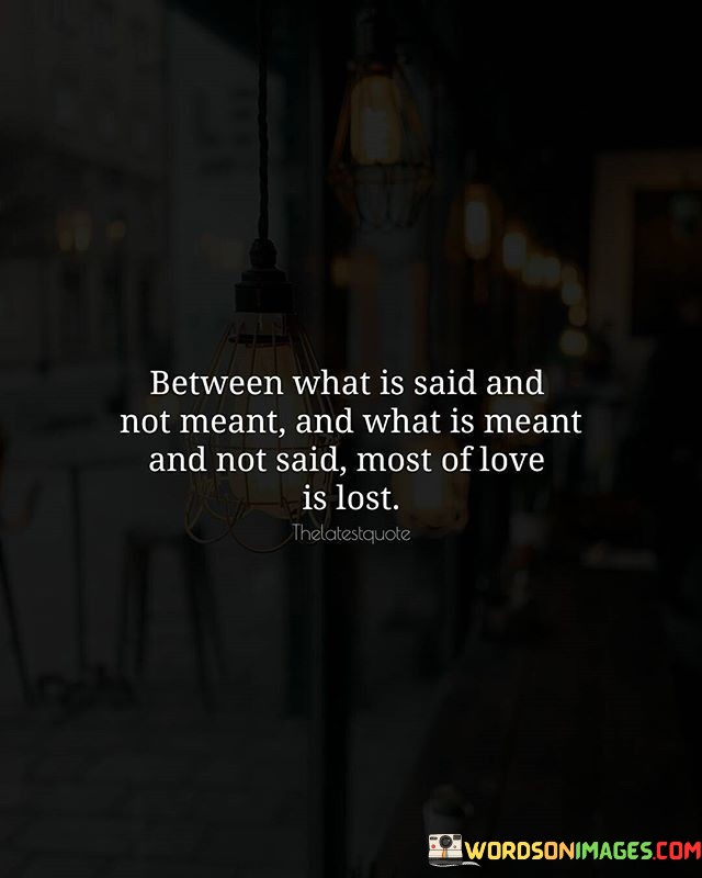 The quote "Between What Is Said And Not Meant, And What Is Meant And Not Said, Most of Love Is Lost" underscores the importance of open communication and the hidden complexities that can lead to misunderstandings and missed connections in relationships.