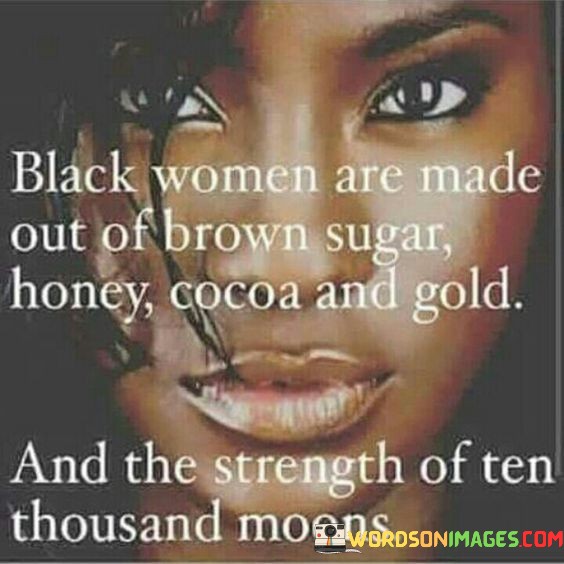 This quote celebrates the beauty and strength of black women. It suggests that black women are made of a combination of natural elements, including brown sugar, honey, cocoa, and gold, which evoke a sense of sweetness, warmth, richness, and value. The quote also suggests that black women possess a strength that is comparable to that of ten thousand moons, emphasizing the power and resilience of black women in the face of adversity.The quote is a celebration of black womanhood and the unique qualities that make black women beautiful and strong. By highlighting the natural elements that make up black women, the quote suggests that black women are inherently valuable and worthy of respect and admiration. The use of brown sugar, honey, cocoa, and gold also evokes a sense of warmth, richness, and sweetness, emphasizing the beauty and allure of black women.Overall, the quote is a celebration of black womanhood and the unique qualities that make black women beautiful and strong. It emphasizes the value, beauty, and strength of black women, and serves as a call to action for society to recognize and appreciate the contributions of black women to the world.