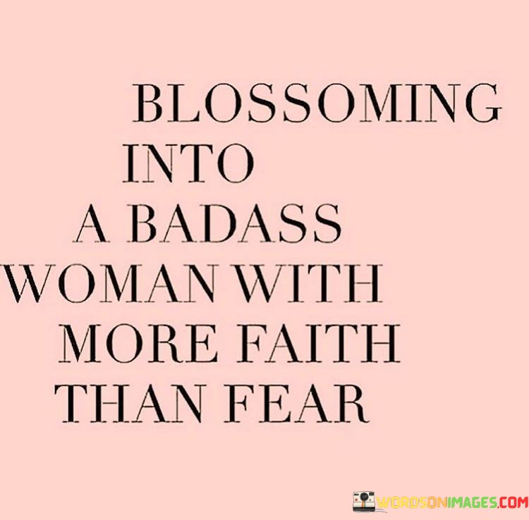 The quote "Blossoming Into A Badass Woman With more faith than fear" celebrates the journey of personal growth and empowerment that a woman undergoes as she evolves into a strong, confident individual. It conveys the idea that, like a flower blossoming, a woman's inner strength and resilience flourish over time, transforming her into a "badass" – a term denoting a fiercely independent, self-assured, and determined individual. The phrase "more faith than fear" emphasizes the shift towards positivity and courage, suggesting that as she grows, she learns to trust in herself and the universe, overcoming doubts and insecurities.The quote recognizes that empowerment is a process, and becoming a "badass" woman doesn't happen overnight. It's a journey of self-discovery and self-belief, where she learns to confront and conquer her fears, allowing her to emerge as a powerful force in her own right. The mention of "faith" highlights the importance of cultivating a positive mindset and believing in her capabilities, even when faced with challenges or uncertainties. It encourages her to embrace her unique qualities, strengths, and experiences, propelling her towards a path of self-fulfillment and self-love.Moreover, the quote celebrates the resilience and tenacity of women, who, despite societal expectations and obstacles, strive to grow and thrive with confidence and grace. It sends a message of encouragement to all women, inspiring them to break free from limitations, embrace their authenticity, and trust in their intuition and abilities. By blossoming into a "badass woman with more faith than fear," she embraces her true self and becomes a beacon of inspiration, not only for herself but also for others on a similar journey of empowerment and self-discovery.