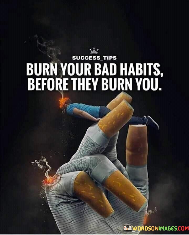 Ultimately, the quote advocates for taking control of our actions and decisions. It prompts us to recognize the potential consequences of our habits. By associating burning bad habits with avoiding harm, the quote empowers us to actively work towards personal growth and well-being.