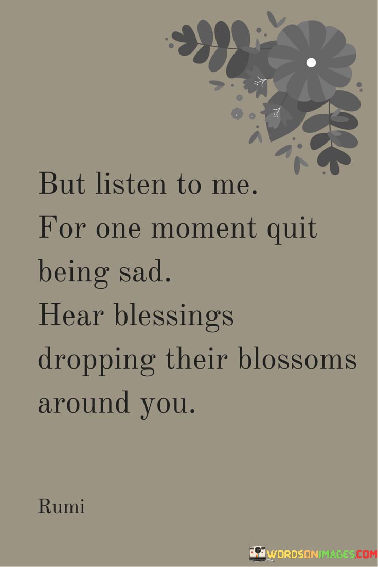 The quote urges a shift in perspective. "Listen to me for one moment" implies attention. "Quit being sad" advises against dwelling in sorrow. "Blessings dropping their blossoms around you" conveys the idea of finding positivity amidst challenges.