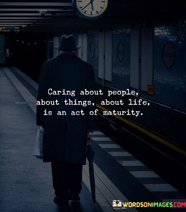 This quote belongs to the category of maturity and compassion, highlighting the significance of empathy and concern for others as markers of personal growth and emotional development. It underscores that maturity involves transcending self-centeredness and embracing a broader perspective. Caring for people and things beyond oneself reflects a deeper understanding of interconnectedness and a willingness to contribute positively to the world.