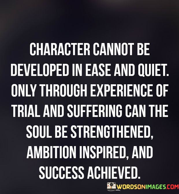 The quote underscores the transformative power of adversity. It implies that facing challenges and enduring suffering are essential for developing strength of character, igniting ambition, and ultimately attaining success.