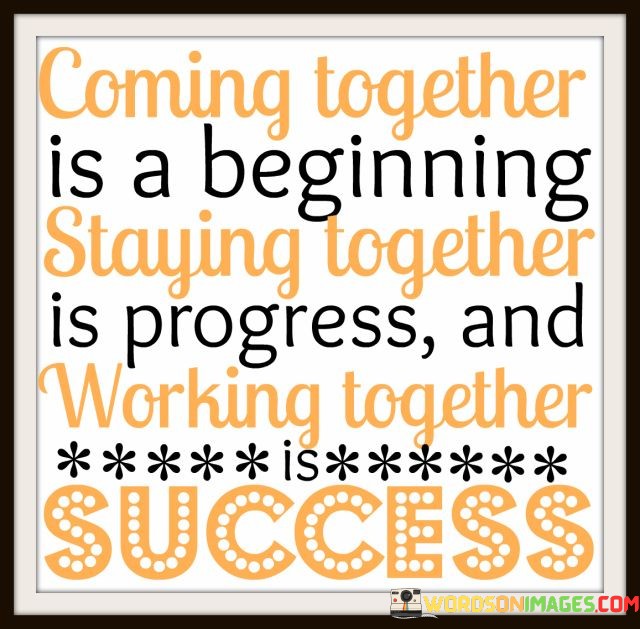 "Coming Together Is A Beginning" encapsulates the inception of endeavors. It denotes the early stages where people unite with shared aspirations, marking the genesis of a project or relationship. It emphasizes the significance of taking that initial step, the foundation upon which future accomplishments are built.