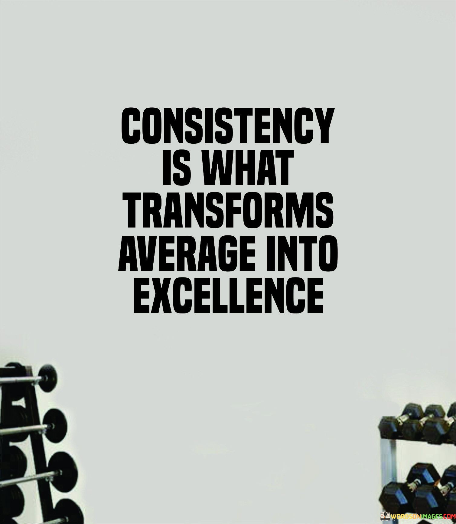 The quote "Consistency is what transforms average into excellence" emphasizes the powerful impact of maintaining a steady and dedicated effort towards a particular goal or endeavor. It underscores the importance of consistently striving for improvement and progress in order to elevate oneself from a state of mediocrity to a state of exceptional achievement. In this context, "average" refers to the standard or ordinary level of performance, while "excellence" represents the highest level of proficiency and accomplishment. The quote implies that the key to reaching excellence lies in the unwavering commitment to consistency and persistent effort. Consistency involves showing up and putting in the work day after day, even when it may not yield immediate or visible results. It means adhering to a routine, staying focused on the goal, and continuously honing one's skills and abilities. It is the small, incremental improvements made consistently over time that eventually lead to remarkable progress and outstanding outcomes. By consistently investing time and effort into a pursuit, individuals can refine their talents, deepen their knowledge, and develop a level of expertise that sets them apart from the rest. Consistency allows for the accumulation of experience and learning, leading to a gradual transformation from being average to achieving greatness. Moreover, consistency nurtures discipline and perseverance, enabling individuals to overcome challenges and setbacks with resilience. It instills a sense of commitment and dedication that fuels the journey towards excellence. The quote serves as a powerful motivator, encouraging individuals to embrace consistency as a cornerstone of success in any domain. Whether it is in academic pursuits, professional endeavors, artistic expression, or personal growth, consistent effort and dedication are the driving forces that propel individuals towards excellence. In conclusion, the quote "Consistency is what transforms average into excellence" inspires us to recognize the significance of staying committed and persistent in our pursuits. It emphasizes the transformative power of small, consistent efforts made over time, which elevate us from mediocrity to greatness. By embracing consistency and dedicating ourselves to continuous improvement, we can unlock our true potential and achieve excellence in whatever we set out to accomplish.