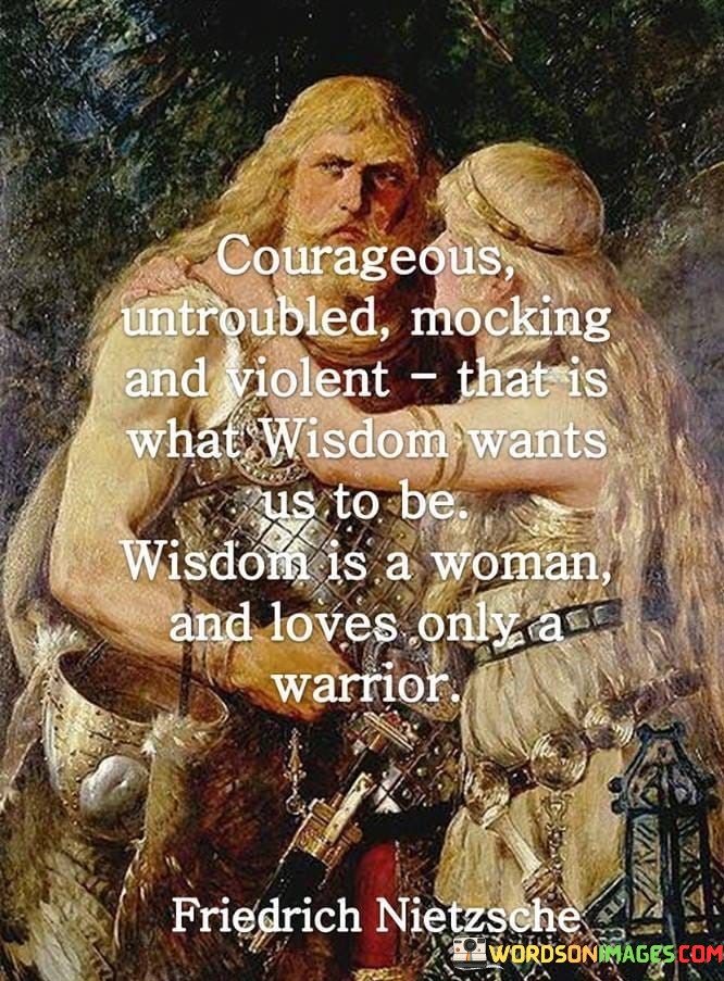 This quote evokes a complex image of wisdom as a strong and multifaceted force. "Courageous, untroubled, mocking, and violent; wisdom wants us to be" portrays wisdom as dynamic, embodying a blend of characteristics that encourage growth and strength.