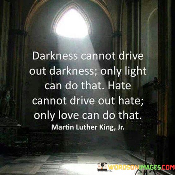 The quote, often attributed to Martin Luther King Jr., carries a profound message of nonviolence and reconciliation. "Darkness cannot drive out darkness" signifies that responding to negativity with more negativity doesn't bring about positive change. Instead, "only light can do that" suggests that it takes positivity and goodness to dispel negativity and darkness.