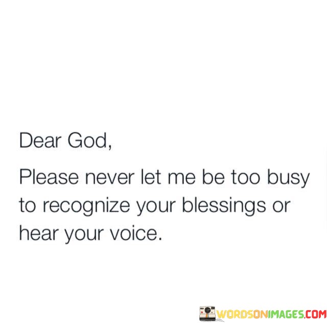 The quote "Dear God, please never let me be too busy to recognize your blessings or hear your voice" reflects a profound desire for spiritual awareness, gratitude, and a deep connection with a higher power. It conveys the importance of staying attuned to the presence of God and the blessings that surround us in the midst of life's busyness.