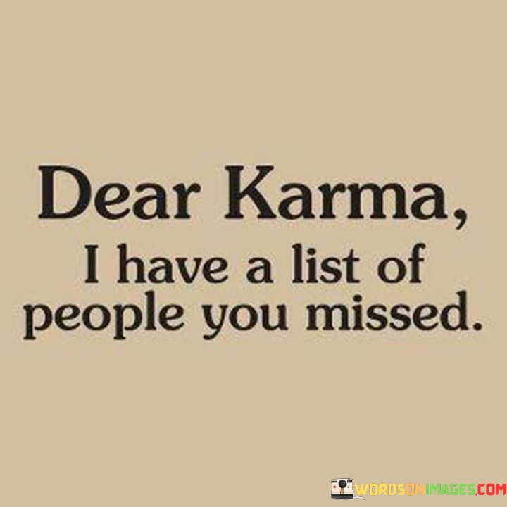 The quote alludes to unaddressed wrongdoings and justice. The phrase "dear karma" suggests addressing the concept of cosmic justice, implying a belief in the principle of cause and effect.