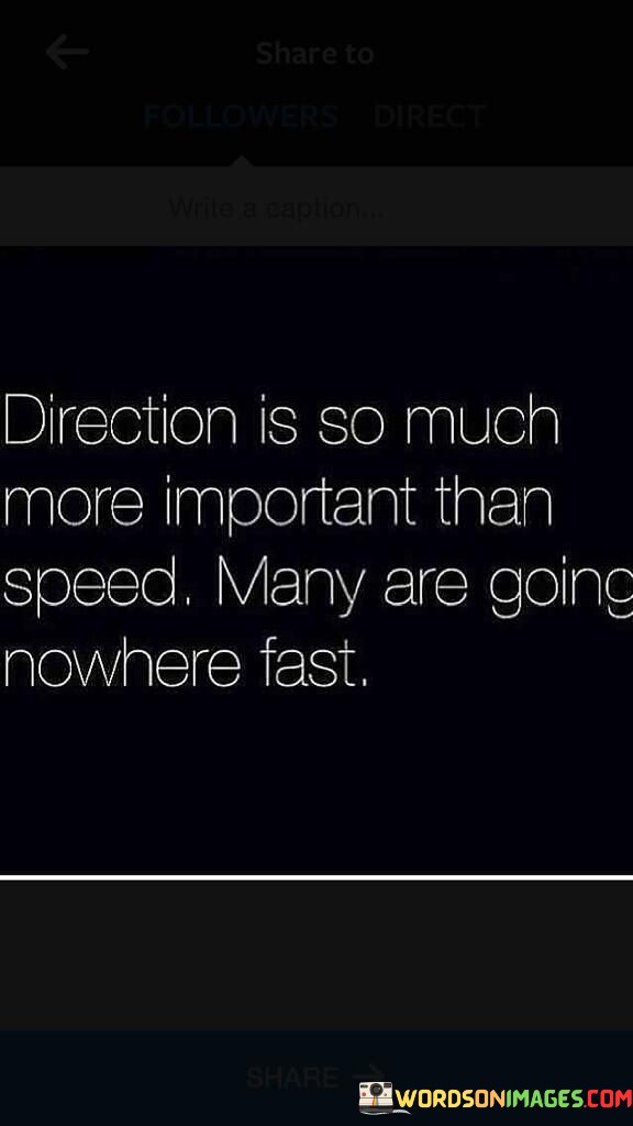 The quote, "Direction is so much more important than speed. Many are going nowhere fast," conveys a profound message about the significance of having a clear purpose and sense of direction in life, rather than simply rushing forward without a meaningful destination. It emphasizes that the speed at which we move is less important than the direction in which we are headed. While some individuals may be in a hurry to achieve their goals or reach success, if they lack a clear vision and purpose, they may find themselves making little progress or even going in circles. The quote encourages us to prioritize introspection and thoughtful planning, ensuring that our actions align with our long-term goals and values. By choosing a purpose-driven path, we can cultivate a sense of fulfillment and make meaningful strides towards personal growth and success. Ultimately, the quote serves as a reminder to focus on the quality of our journey, the alignment of our actions with our vision, and the wisdom of pursuing meaningful goals, rather than rushing forward without purpose, only to find ourselves going nowhere fast. At its core, the quote celebrates the importance of intentionality and mindfulness in life. It cautions against mindless haste and the pursuit of speed without a clear sense of direction. When we are driven by a sense of purpose and direction, we are more likely to make purposeful decisions that lead to genuine progress and fulfillment. Moreover, the quote speaks to the concept of conscious living and thoughtful decision-making. It encourages us to reflect on our goals and values, ensuring that our actions are aligned with our true aspirations rather than being guided solely by external pressures or the desire for immediate results. Furthermore, the quote highlights the potential pitfalls of chasing speed and instant gratification. Many individuals may be in a rush to achieve success or attain their goals quickly, but without a well-defined direction, they may find themselves stuck in a cycle of busyness without making meaningful progress towards their ultimate objectives. In conclusion, the quote "Direction is so much more important than speed. Many are going nowhere fast" underscores the significance of having a clear sense of purpose and direction in life. It encourages us to prioritize thoughtful planning and intentional action, ensuring that our choices align with our long-term goals and values. Rather than rushing forward without purpose, the quote reminds us to be mindful of the quality of our journey and the wisdom of pursuing meaningful goals. By focusing on direction rather than speed, we can cultivate a sense of fulfillment and make genuine progress towards personal growth and success. This quote serves as a powerful reminder to be purpose-driven, align our actions with our vision, and embrace a path of conscious living that leads to meaningful achievements and a sense of fulfillment in life.