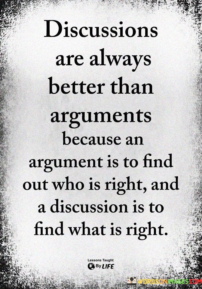 The quote "Discussions are always better than arguments because an argument is to find out who is right, and a discussion is to find what is right" highlights the value of constructive communication and the difference between seeking truth and asserting dominance.
