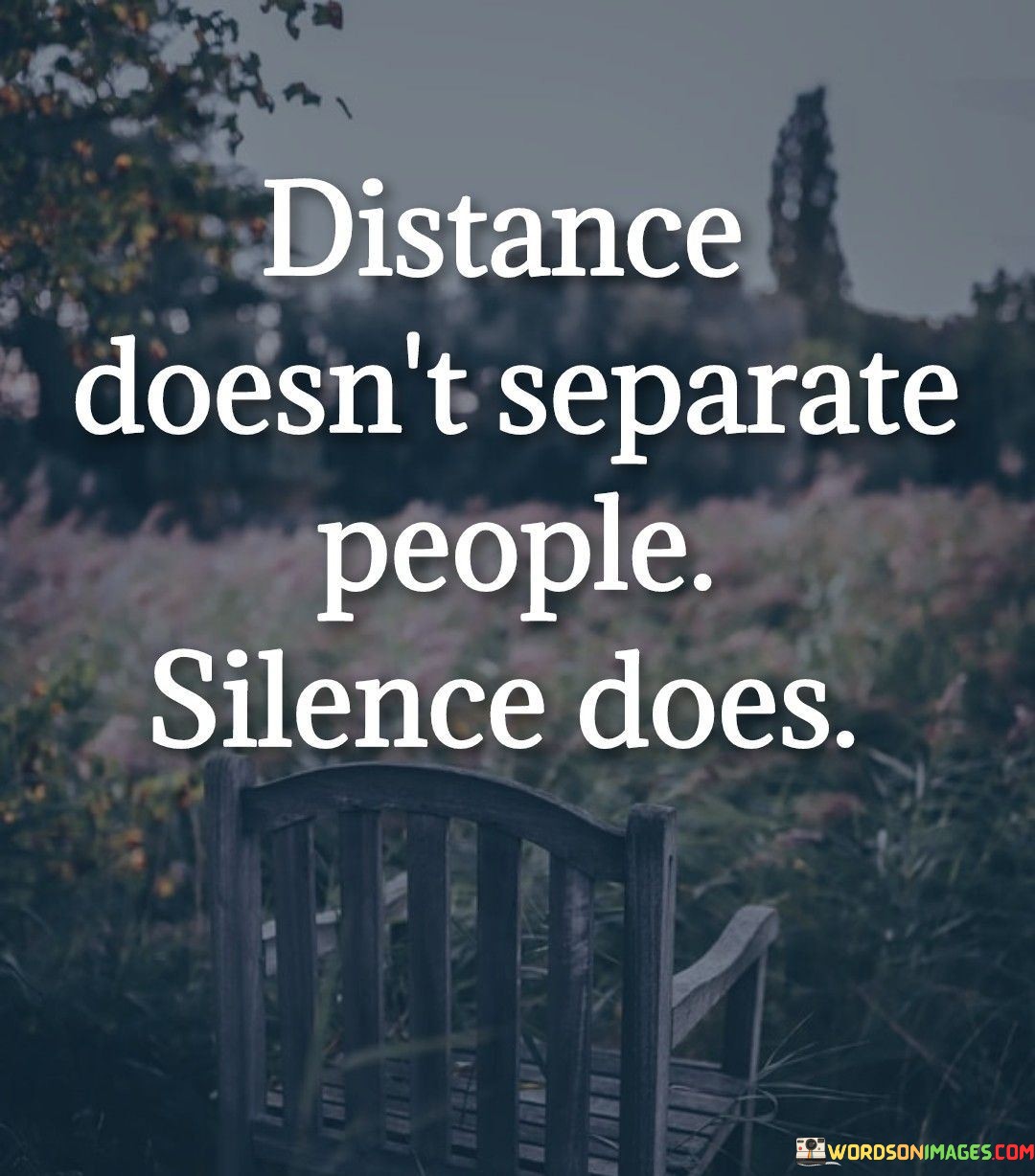 This quote means that physical distance between people doesn't necessarily create a divide, but rather it's the lack of communication or silence that creates a sense of separation. Physical distance, like living far apart, can be managed through various means of communication, like phone calls, messages, or video chats. These methods help people feel connected and maintain their relationships despite the distance.