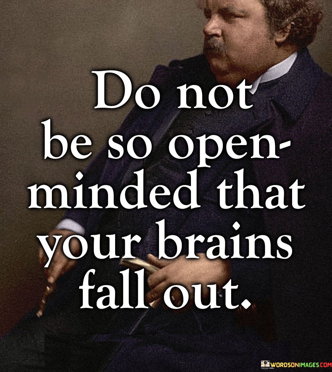 This quote warns against excessive open-mindedness in the first paragraph. While being open-minded is generally positive, the quote metaphorically advises against being so receptive to new ideas that one's logical thinking becomes compromised. It suggests that an overly open mind can lead to losing critical thinking skills, analogous to how a brain might fall out of an open skull.