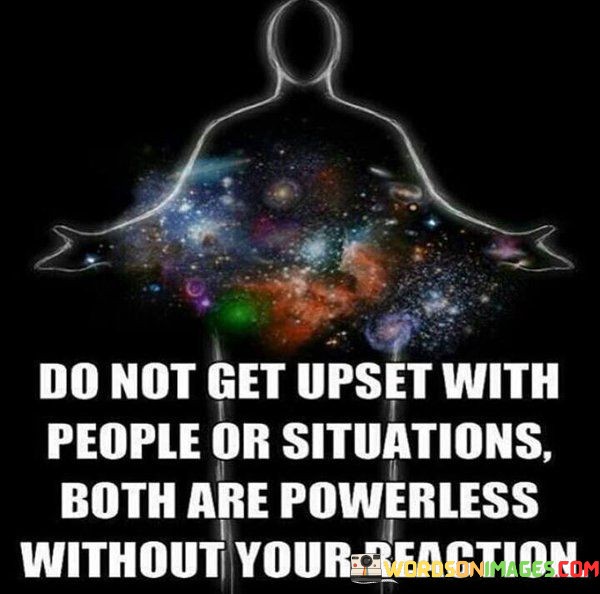 This quote conveys the idea that one's emotional response holds the power in any situation. The first part, "do not get upset with people or situations," encourages emotional detachment and implies that getting upset is a choice. It suggests that reacting with frustration or anger to external factors is unnecessary.