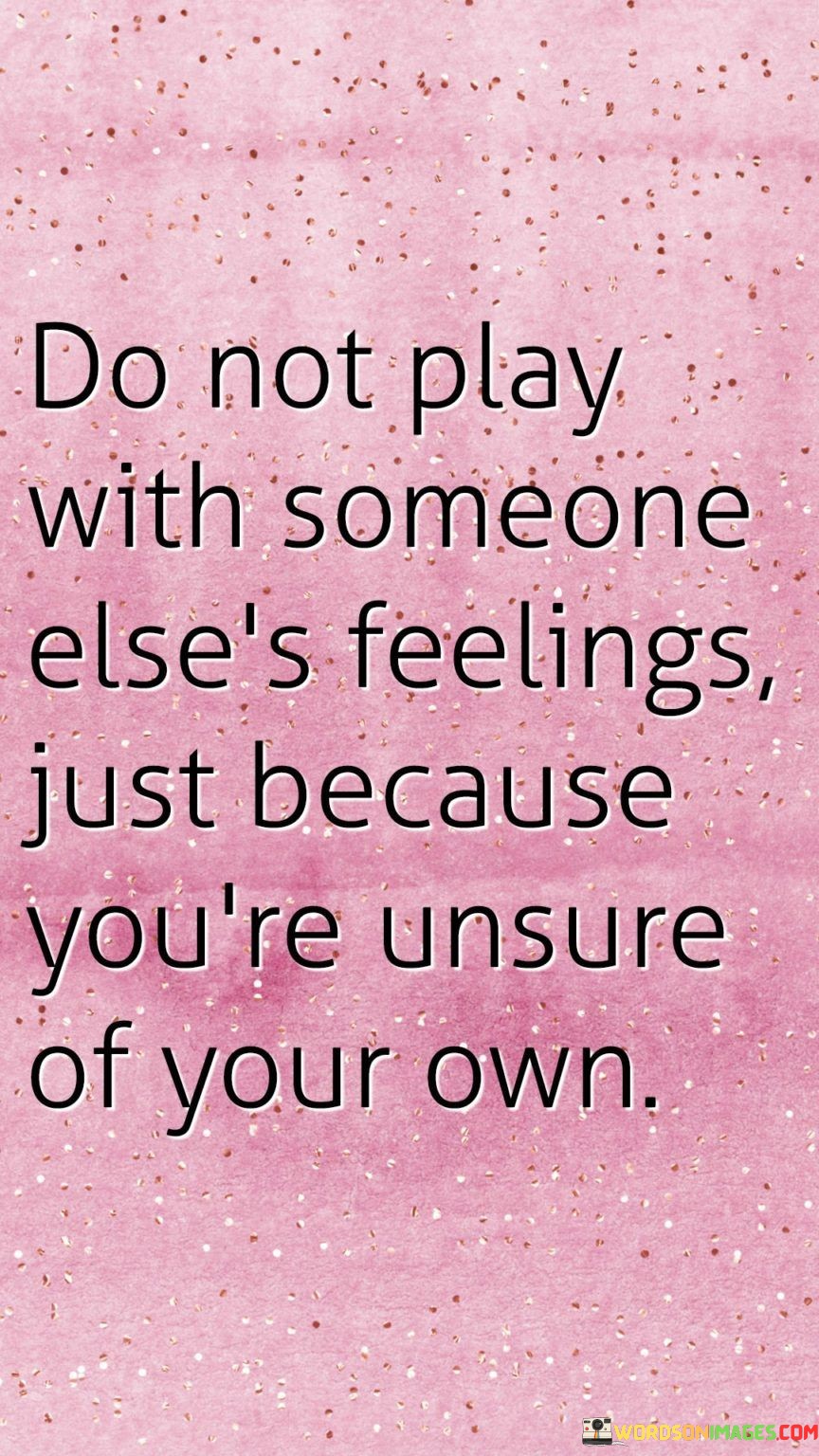 The quote cautions against toying with others' emotions due to personal uncertainty. It suggests that using someone's feelings as a testing ground for one's own emotions is unfair. This viewpoint underscores the importance of respecting others' emotions and being honest about one's own.