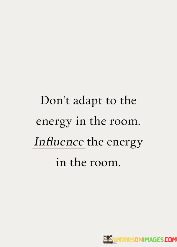 This quote emphasizes the power of one's presence and attitude in influencing the atmosphere around them. In the first sentence, "don't adapt to the energy in the room," it suggests that instead of conforming to the prevailing mood or vibe in a space, individuals should remain true to their own positivity and authenticity. This speaks to the idea of not letting external circumstances dictate one's internal state.