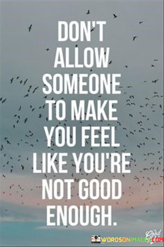 This quote empowers self-worth. "Don't allow someone" asserts personal control. "Make you feel like you're not good enough" addresses self-doubt. It advocates for guarding against external influences that undermine confidence, fostering self-belief and resilience against negative judgments or opinions.