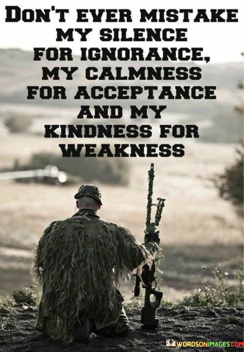 This quote serves as a reminder not to misinterpret someone's demeanor or actions. It suggests that silence does not equate to ignorance; a person may choose not to speak, but it doesn't mean they lack knowledge or understanding. Similarly, displaying calmness doesn't imply acceptance of a situation, and exhibiting kindness doesn't indicate weakness.
