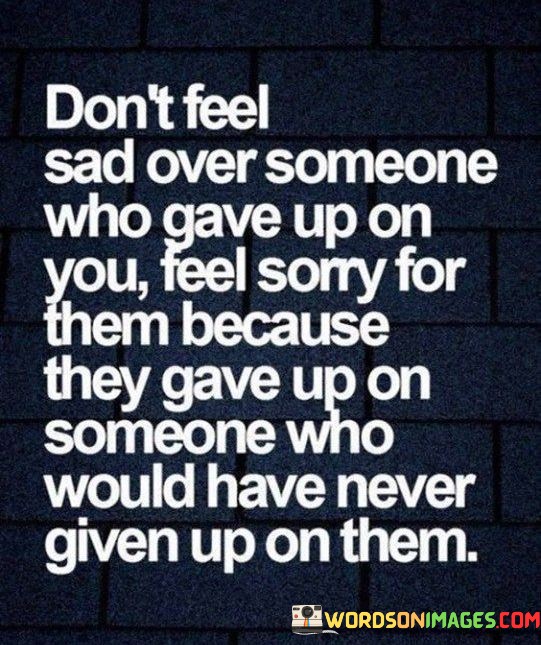 The quote underscores empathy in heartbreak. "Feel sorry for them" conveys compassion for their decision. "Gave up on someone who would have never given up on them" illustrates the perceived imbalance, emphasizing the other person's loss.