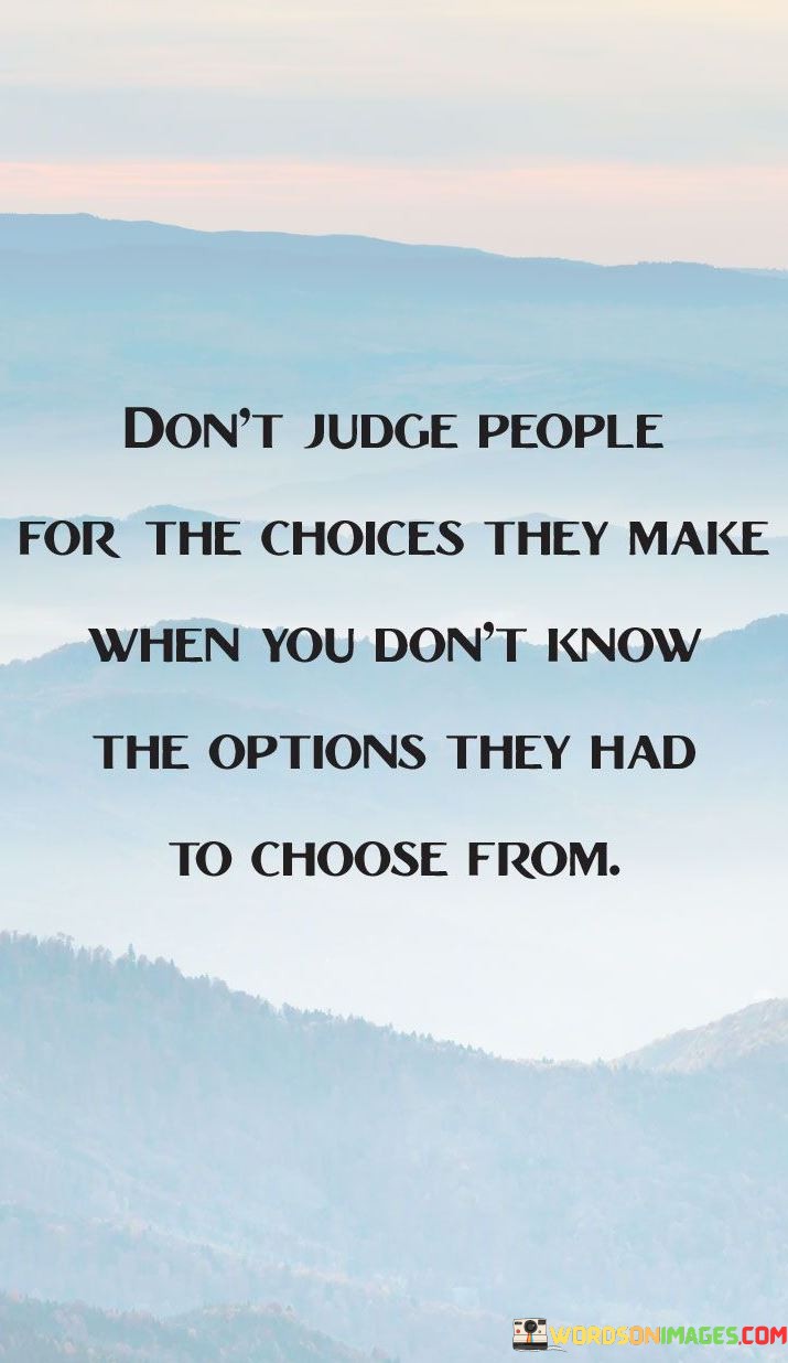The statement "Don't judge people for the choices they make when you don't know the options they had to choose from" encourages us to refrain from passing judgment on others' decisions without understanding the full context and circumstances they faced. People make choices based on a myriad of factors, including their past experiences, personal beliefs, available resources, and the opportunities presented to them. Each individual's life journey is unique, and what may seem like an obvious choice from an outsider's perspective may be significantly more complex when seen through the lens of the person making the decision. Judging others without knowing the full scope of their options can be unfair and misguided. It overlooks the challenges and constraints they may have encountered, as well as the emotional and psychological factors that influenced their choices. By practicing empathy and withholding judgment, we allow room for compassion and understanding. We may not always agree with the decisions people make, but acknowledging that we may not fully comprehend their circumstances can lead to more compassionate interactions. It is essential to recognize that individuals may have faced limited or difficult choices that forced them to make decisions that might appear unconventional or unideal to others. Rather than rushing to judgment, it is more constructive to seek to understand their experiences and perspectives. A non-judgmental approach opens the door to meaningful conversations and the opportunity to support others in challenging times. Instead of criticizing, we can offer empathy, encouragement, and assistance if needed.
