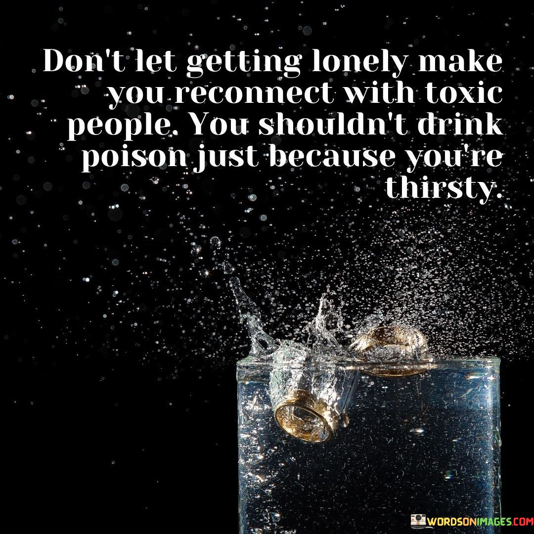 The quote advises against seeking companionship out of desperation. "Getting lonely" signifies emotional vulnerability. "Reconnect with toxic people" warns against compromising well-being. The quote uses the metaphor of "drink poison" to illustrate the dangers of seeking solace in harmful relationships.