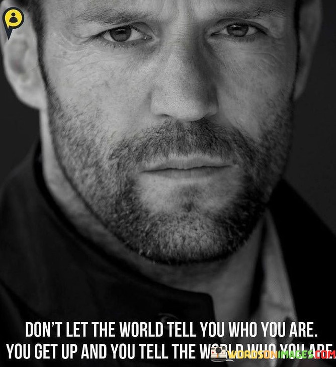 "Don't let the world tell you who you are; you get up and you tell the world who you are" emphasizes the importance of self-empowerment and self-definition. It encourages individuals to assert their identity, values, and aspirations, regardless of external influences or expectations.