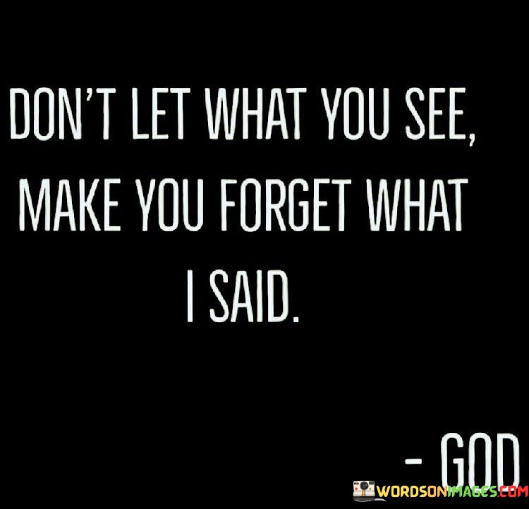 In a broader context, this quote implies that there are times when external appearances, circumstances, or evidence may seem to contradict or challenge what has been communicated or promised. It could be a reminder to hold steadfast to one's convictions, principles, or beliefs, even when the immediate surroundings or situations appear to suggest otherwise.