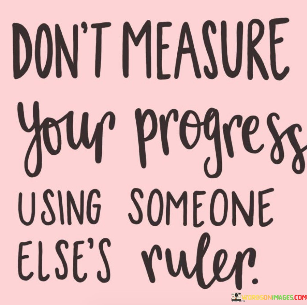 The quote, "Don't measure your progress using someone else's ruler," delivers a powerful message about the danger of comparing ourselves to others and the importance of embracing our individual journeys. It emphasizes the significance of self-awareness, authenticity, and staying true to our unique path in life. The quote urges us not to base our sense of progress or success on external standards set by others but to define our own measures of growth and achievement. When we constantly compare ourselves to others, we undermine our self-esteem and rob ourselves of the opportunity to recognize our own accomplishments and strengths. Instead, the quote encourages us to focus on our personal growth, acknowledging that each person's journey is unique and valuable in its own way. By liberating ourselves from the need for external validation and embracing our individuality, we empower ourselves to chart a course that aligns with our true desires and aspirations, fostering a sense of fulfillment and self-worth that comes from recognizing and celebrating our own progress. At its core, the quote celebrates the importance of self-acceptance and self-compassion. By cautioning against measuring our progress using someone else's ruler, it encourages us to recognize our inherent worth and embrace our unique qualities and experiences. Each person's life journey is shaped by their individual circumstances, challenges, and aspirations, making it unfair and unrealistic to compare our progress to that of others. Moreover, the quote speaks to the dangers of the comparison trap, which can lead to feelings of inadequacy and discontent. When we constantly measure ourselves against others, we risk losing sight of our own accomplishments and strengths. It is essential to recognize that every individual has their own path and timeline for growth, and comparing ourselves to others is a disservice to our own unique journey. Furthermore, the quote underscores the importance of setting personal goals and standards for measuring progress. Instead of relying on external benchmarks or societal expectations, it encourages us to define success on our terms and celebrate the small victories and milestones that are significant to our personal growth and development. In conclusion, the quote "Don't measure your progress using someone else's ruler" reminds us of the dangers of comparison and the importance of embracing our individuality and journey. It advocates for self-acceptance, self-compassion, and the recognition that each person's progress and achievements are unique and valuable. By focusing on our personal growth and setting our own measures of success, we free ourselves from the constraints of external validation and cultivate a sense of fulfillment and self-worth that comes from recognizing and celebrating our own accomplishments. Embracing our individuality and staying true to our path empowers us to chart a course that aligns with our true desires and aspirations, fostering a greater sense of purpose and contentment as we navigate our journey through life.