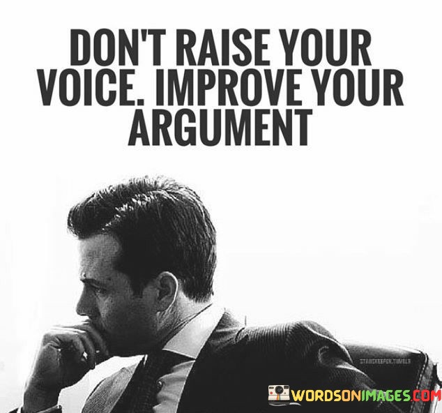 This quote advocates effective communication. "Don't raise your voice" discourages shouting. "Raise your words" highlights impactful expression. It emphasizes that articulating thoughts thoughtfully and respectfully is more persuasive than resorting to aggression, fostering understanding and productive conversations.