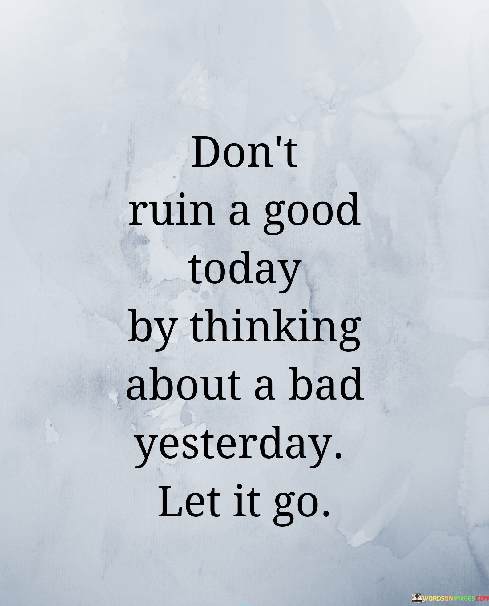 The quote highlights the importance of living in the present. "Don't ruin a good today" emphasizes the value of the current moment. "Thinking about a bad yesterday" signifies dwelling on past regrets. The quote encourages the release of negative thoughts about the past to fully appreciate the present.