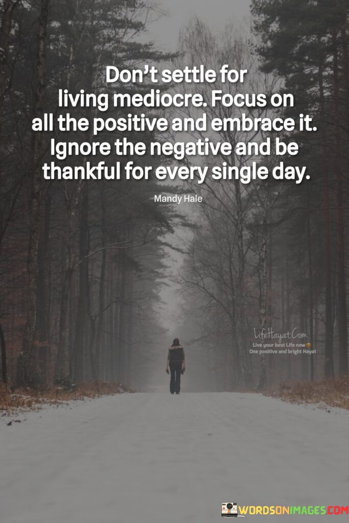 This quote encourages a positive and proactive approach to life. It suggests avoiding mediocrity by focusing on the positive aspects and embracing them fully. This perspective emphasizes the power of mindset and gratitude in shaping one's experience.