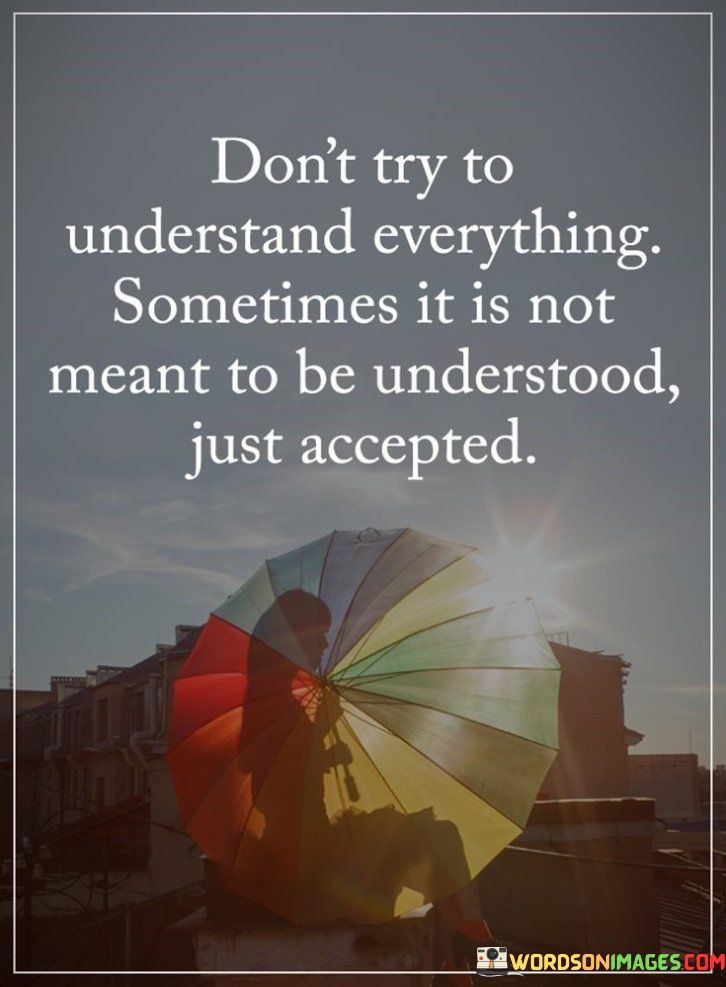 The statement "Don't try to understand everything; sometimes it is not just meant to be understood, just accepted" offers a valuable perspective on acceptance and the limits of human understanding. As curious beings, we often strive to comprehend the complexities of life, relationships, and the world around us. However, there are instances where certain aspects of existence may remain elusive or beyond our full comprehension. In such cases, it is essential to recognize that not everything is meant to be fully understood. Some phenomena, emotions, or experiences may transcend our cognitive capabilities, and attempting to grasp them entirely may lead to frustration or a sense of inadequacy. Instead of obsessing over understanding everything, the statement encourages us to practice acceptance. Acceptance involves embracing the unknown and acknowledging that it is natural for there to be mysteries and unanswered questions in life. Acceptance does not imply giving up on seeking knowledge or growth. It is about recognizing that there are inherent limitations to our understanding, and that is okay. By accepting what we cannot fully comprehend, we create space for peace and contentment within ourselves. Acceptance also allows us to let go of the need for control. When we accept that not everything can be fully understood, we become more open to the unpredictability and uncertainty of life. This mindset fosters resilience and adaptability in the face of challenges and changes. Moreover, the act of acceptance extends beyond the external world to include our internal experiences and emotions. Sometimes, we may struggle to understand our own feelings or reactions, and that is normal. Instead of overanalyzing, we can practice self-compassion and allow ourselves to feel without judgment.