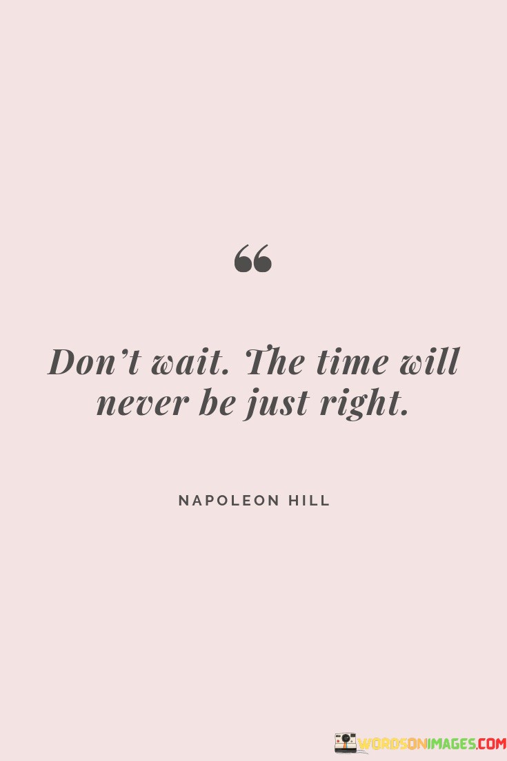 The quote's second paragraph suggests that waiting for the "right" time might lead to missed opportunities. Instead of waiting for everything to align perfectly, it's better to take action and make things happen.